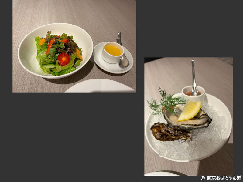 料理は、小さいサラダに生ガキ、イカのフリット、肉、にしました。